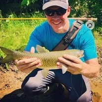 My largest fish on the fly to date. An unknown weight grass carp next to my 8 foot 4WT rod.